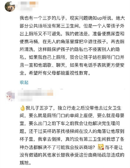 也有獨自帶兒子外出的寶媽們給出了不進女廁的解決辦法。