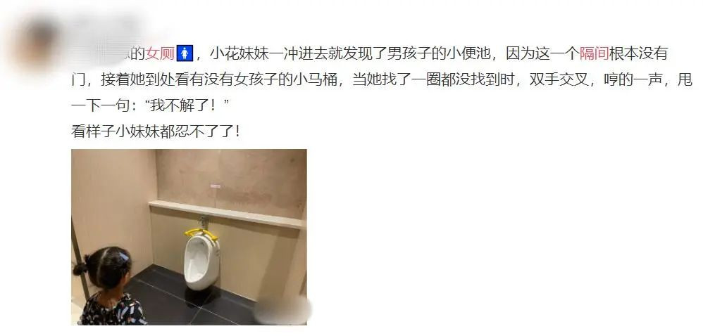 再加上五一小長假期間,各大景點、商場人流密集,媽媽帶男童上女廁的場景幾乎是處處可見。甚至有些商場還在女廁所安裝男童便池,為其提供便利。