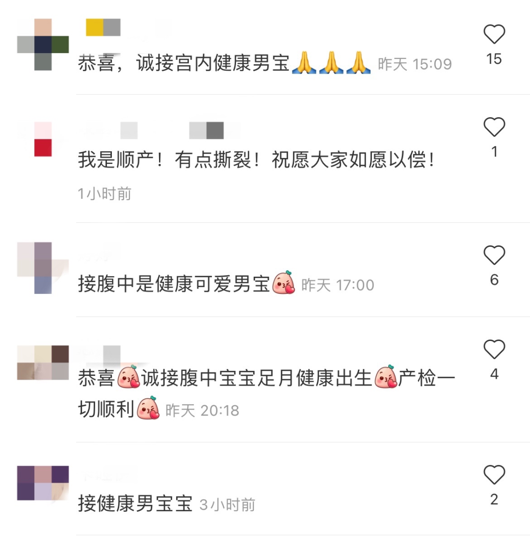 這位媽媽秒變“男寶錦鯉”,評論處迅速集齊“接男寶”隊伍:“恭喜,誠求生健康男寶”、“接腹中是健康男寶”、“誠接腹中男寶足月健康出生”。