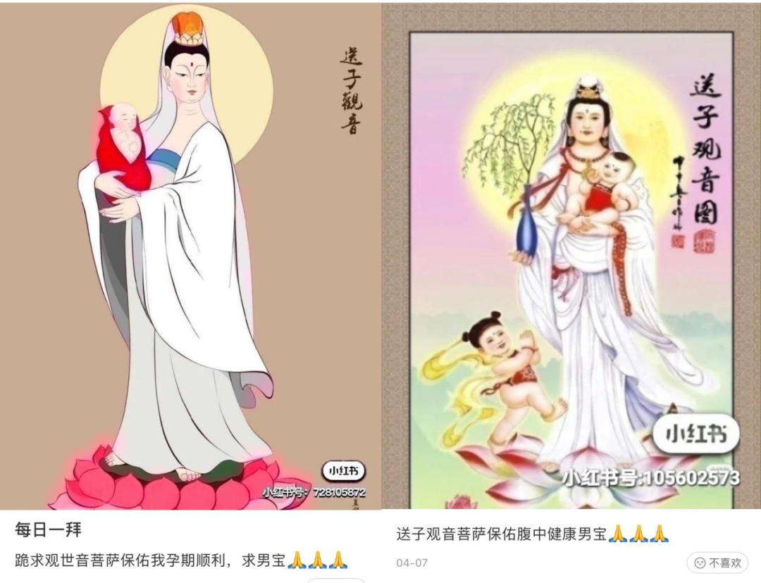小紅書上的“接男寶”有一套行為模式,初級操作是拜送子觀音。有人每日一拜,請“送子觀音”保佑自己生男寶。