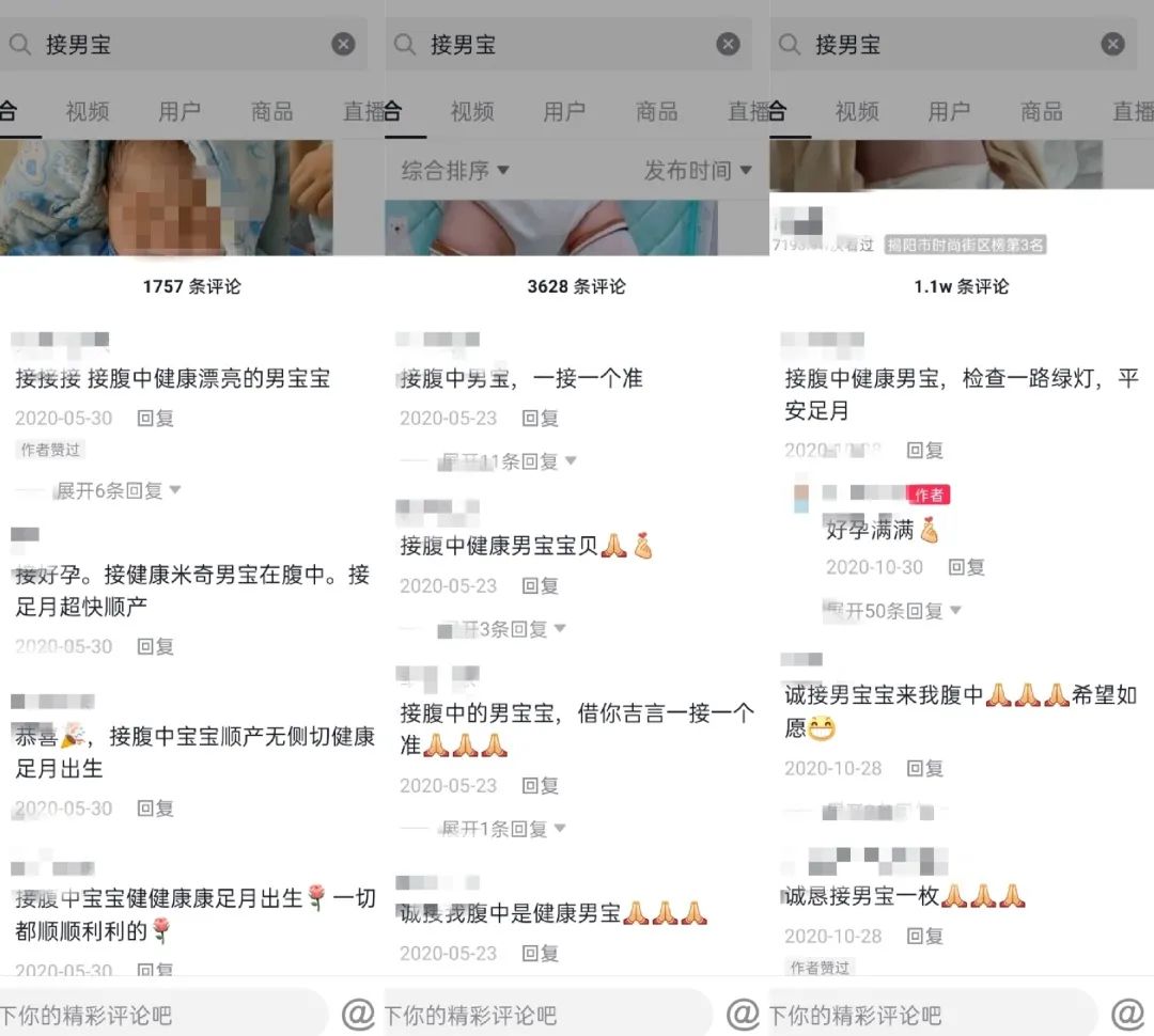 “接男寶”現象最先是在抖音上發酵。2019年一位媽媽在抖音上發佈“接男寶”視頻,聲稱自己生下的6斤男寶寶,就是在抖音上接的。