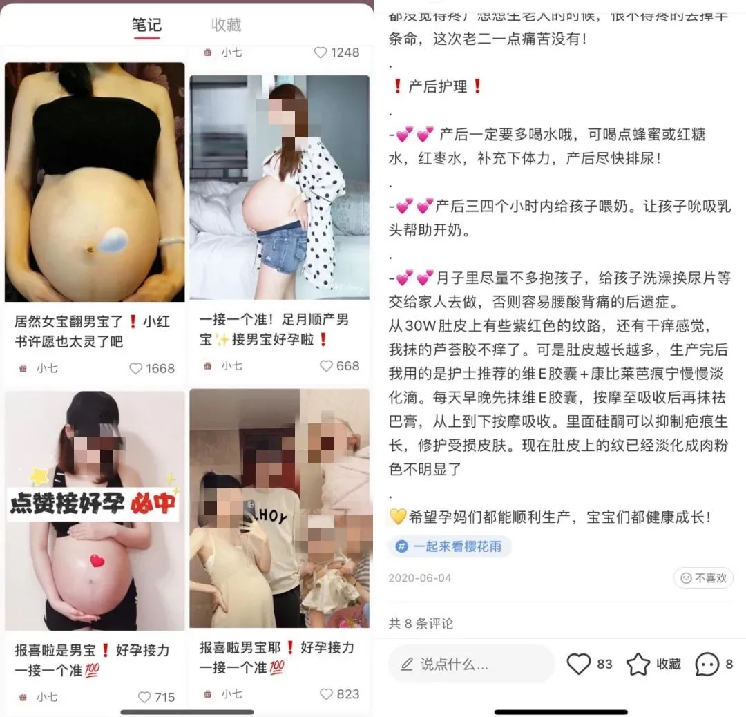 在小紅書上,她瞭解了孕媽們的黑話,生孩子叫“卸貨”、B超檢測是女孩也可以祈禱“女翻男”,生下男孩後要回小紅書“還願”等。