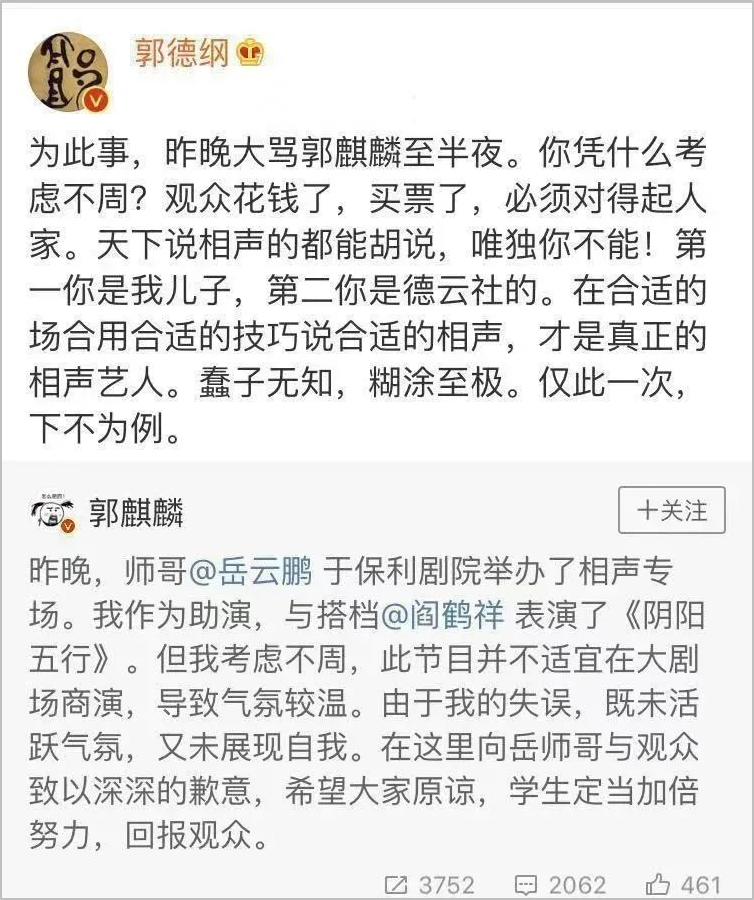有一次郭麒麟上台表演的效果不好,在微博道歉,自己本來就已經很愧疚,卻被老爸郭德綱又罵了一頓,一點也不講“父子情面”。