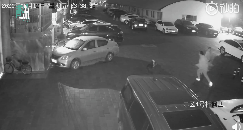 監控錄像顯示,事情發生於今年3月12日晚23點38分許,當時72歲的趙某在小區遛狗時,一隻未栓繩的狗突然竄出,與趙某的狗撕咬在一起。