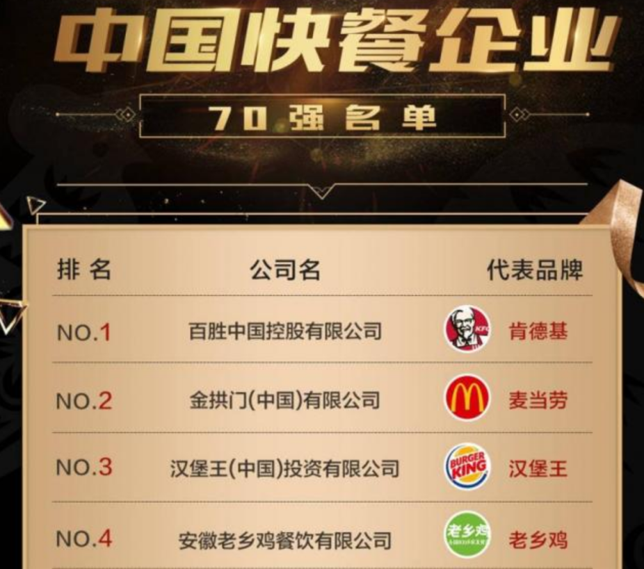 在中國烹飪協會舉辦的“第23屆中國快餐產業大會”上,“中國快餐70強”榜單發佈,主要依據企業規模、品牌價值、品牌影響力等維度對各大快餐企業進行排名。榜單中,佔據榜單前三位的肯德基、麥當勞、漢堡王均為外來品牌,而第四名就是束從軒的老鄉雞。