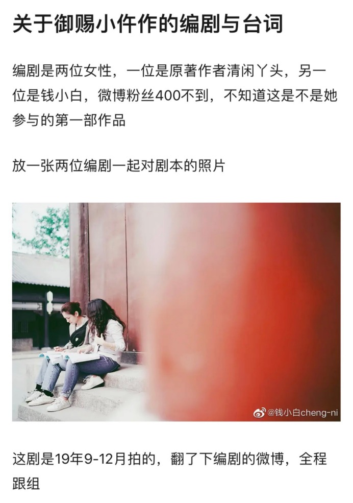 昨天的微博熱搜中,兩位編劇清閒丫頭與錢小白一起看劇本的照片成為熱議,俘獲好一波好評。