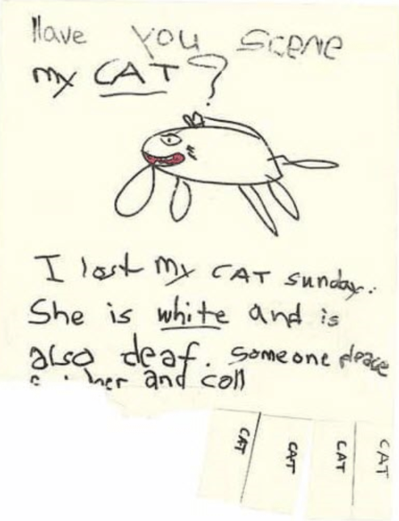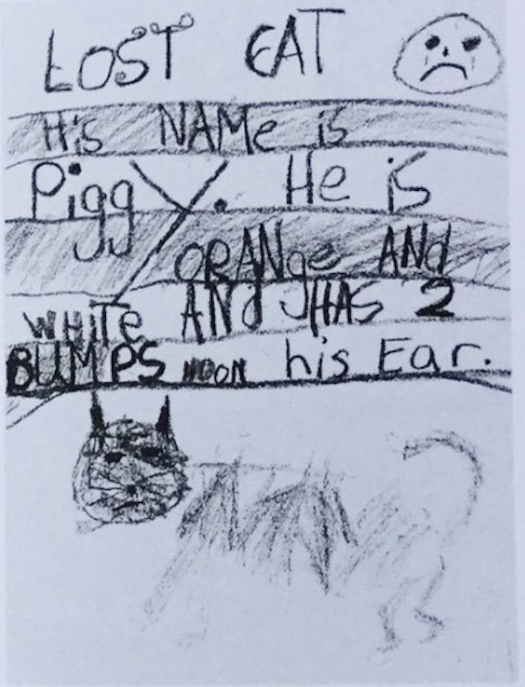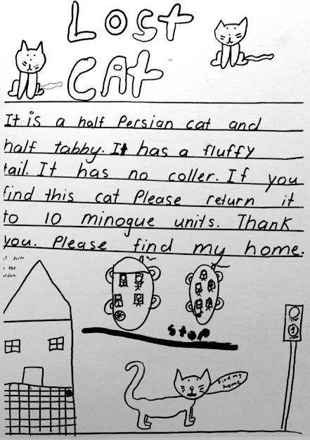 有一些尋寵啓事來自小朋友,雖然畫得有些簡單粗糙,但一如伊恩所説:“小孩子畫的那些東西特別令人心碎。”