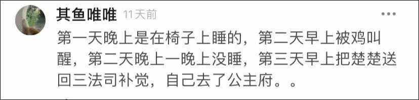 第一天晚上是在椅子上睡的,第二天早上被雞叫醒,第二天晚上一晚上沒睡,第三天早上把楚楚送回三法司補覺,自己去了公主府……