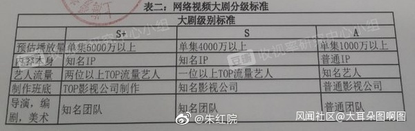 據娛樂影視博主@硃紅院 發佈的一張表格,愛優騰等網絡平台將大劇級別標準分為S+,S,和A,以及未進入該表格的B。S+的劇集,需是知名IP、兩位以的TOP流量藝人、TOP影視公司的強強聯合。