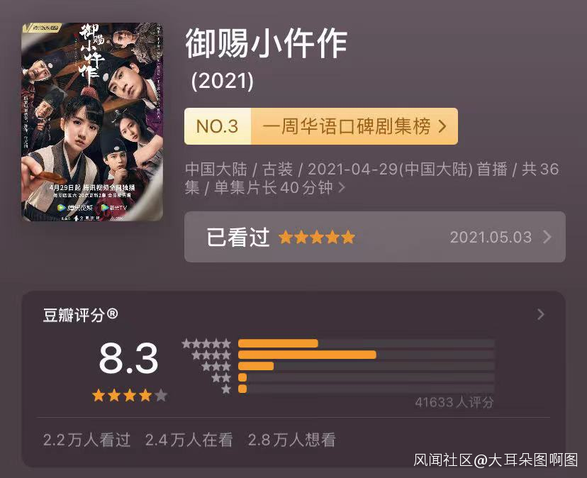 近日,卻有一部“無流量、經費低、少宣發”的網劇竄上熱搜。這部由樓健導演,演員蘇曉彤、王子奇主演的古裝探案喜劇《御賜小仵作》於4月底在騰訊視頻開播,截至發文已在豆瓣獲得8.3的高分。