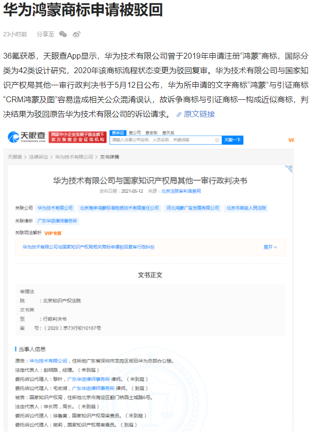 華為鴻蒙商標被駁回複審,涉及商標易造成混淆。