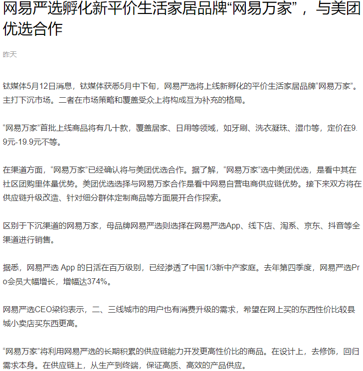 5月中下旬,網易嚴選將上線新孵化的平價生活家居品牌“網易萬家”,主打下沉市場。二者在市場策略和覆蓋受眾上將構成互為補充的格局。在渠道方面,“網易萬家”已經確認將與美團優選合作。