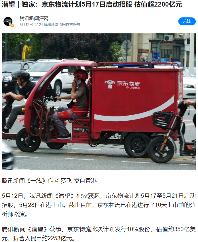 京東物流計劃5月17至5月21日啓動招股,5月28日在港上市。截止目前,京東物流已在港進行了10天上市前的分析師路演。據悉,京東物流此次計劃發行10%股份,估值約350億美元,摺合人民幣約2253億元。