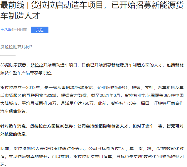 貨拉拉開始啓動造車項目,以實現物流鏈條閉環和車的“數智化”,目前已開始招募新能源貨車製造方面的人才,包括新能源貨車整車產品專家等職位。