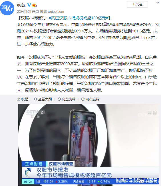 艾媒諮詢報告顯示,中國漢服愛好者數量規模和市場規模快速增長,預測2021年漢服愛好者數量規模達689.4萬人,市場銷售規模將達到101.6億元。