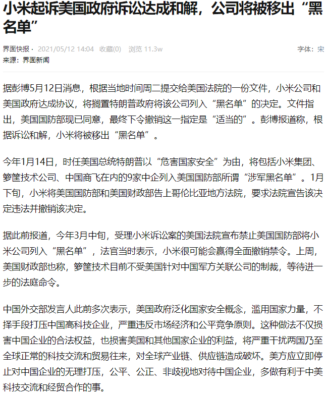 小米起訴美國政府訴訟達成和解,公司將被移出“黑名單”。今年1月14日,時任美國總統特朗普以“危害國家安全”為由,將包括小米集團、籮筐技術公司、中國商飛在內的9家中企列入美國國防部所謂“涉軍黑名單”。