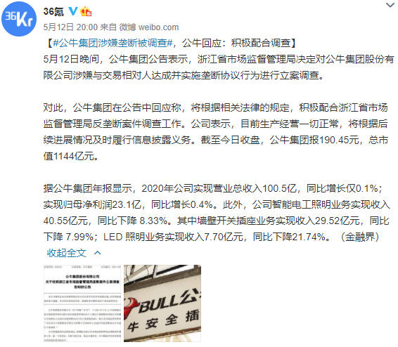 公牛集團涉嫌壟斷被調查,公司回應稱將積極配合,目前生產經營一切正常。