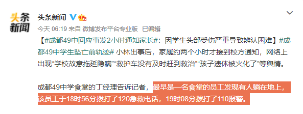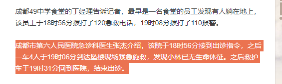 最早的發現者是一名食堂的員工,他無法辨認這學生是誰,只能第一時間撥打了120急救電話,然後又打了110報警: