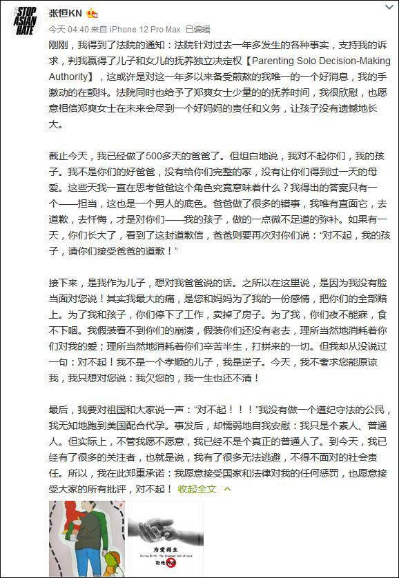 張恆稱獲得孩子撫養獨立決定權,還"向祖國致歉"_風聞