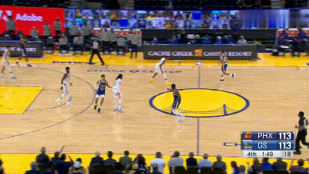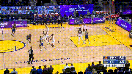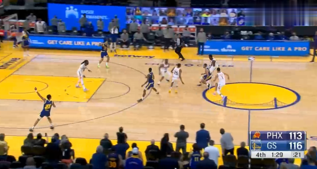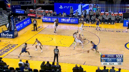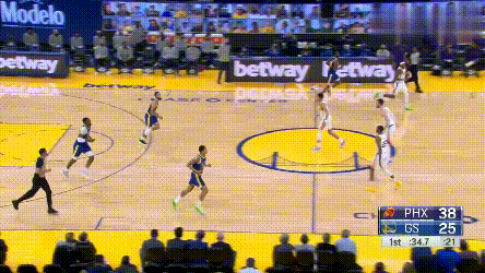 勇士防邊線球,格林先接管了切入的布克,然後沒有去管提上的艾頓——因為他在那個位置接球沒威脅——之後立刻接管了切入的布里奇斯——布克和布里奇斯大概是太陽這次邊線球的第一和第二接球點,都被拆穿,於是太陽違例。