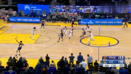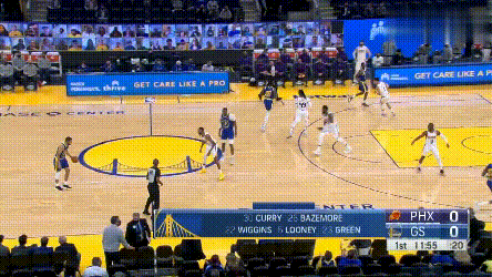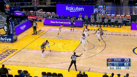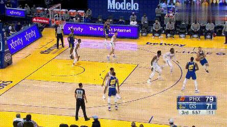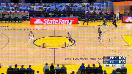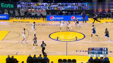 也正是因為這三人缺少得分威脅,勇士的戰術發起幾乎都把他們安排在了弧頂。如果放在籃下,他們沒有大中鋒的正面接餅的終結把握,如果放在底角則更加沒有牽制力。這點可以從格林少數站底角的回合看出來: