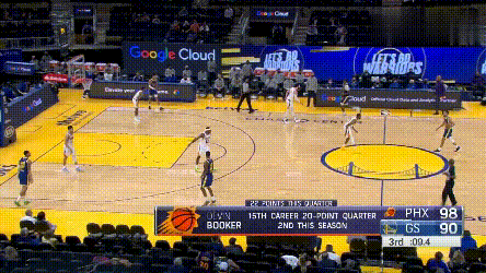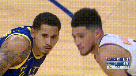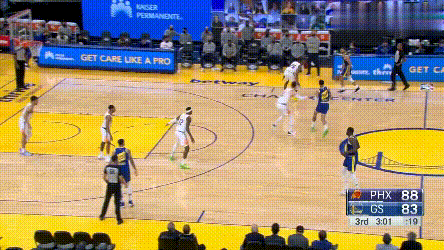 但是,有卡明斯基護筐在這場比賽裏,已經是太陽保護籃下條件不錯的回合。更慘的情況是,太陽體型最大的三個球員,布里奇斯在防庫裏,中鋒和另一個前鋒在夾擊庫裏,於是太陽本場比賽事實上大量保護籃下的球員是布克,而布克被維金斯、格林們統治了: