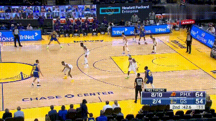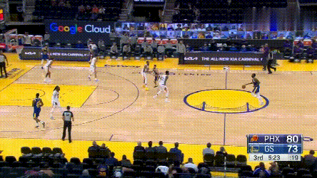 但即便格林、盧尼和安德森們能在弧頂做這種快速處理,這種上線3人配合只有一人有三分威脅的情況,還是可能讓防守方搞出一些名堂。3人圍堵庫裏,的確讓他在一些回合裏很難出球,太陽這麼防也確保了上線防擋拆不被直接攻破。