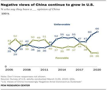 可以説,特朗普時期中美關係持續下行的強大慣性,使上任初期的拜登在中美關係上的迴旋空間並不大。2020大選期間,兩黨候選人將中國作為攻擊對象,都宣稱自己上台後能夠遏制中國的“修正主義”行徑,拜登更是屢次直言特朗普的對華政策是軟弱且無效的。既然批評中國已經成為了美國黨派政治中的政治正確,拜登自然不會甫一上任就改變對華政策導向,以免造成民主黨內部的分歧和共和黨更為激烈的攻擊。對於美國普通民眾而言,對中國的好感也降至冰點。據蓋洛普的調查結果,僅有百分之二十左右的美國人對中國有好感,這個數字創下了四十年來的新低。拜登需要穩住民眾支持率,以便為民主黨明年的中期選舉創造有利條件,這意味他不得不展現對華強硬的姿態以鞏固選民基礎。