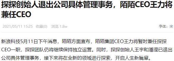 陌陌方面宣佈,陌陌集團CEO王力將暫時兼任探探CEO一職,探探團隊仍將繼續保持獨立運營。同時,探探創始人王宇和潘瀅已退出公司具體管理事務。