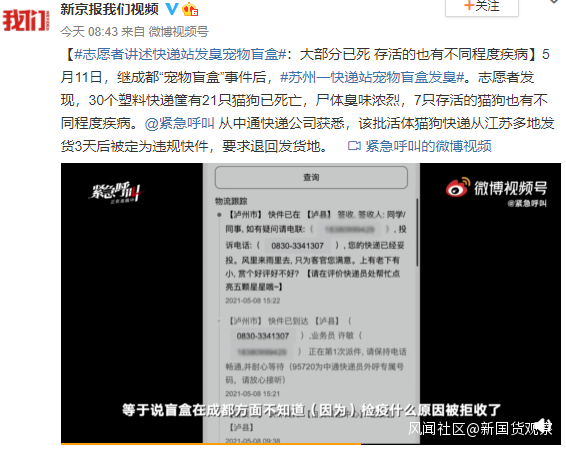 繼成都“寵物盲盒”事件後,有志願者在蘇州中通快遞站發現活體貓狗快遞。志願者發現,30個塑料快遞筐有21只貓狗已死亡,屍體臭味濃烈,7只存活的貓狗也有不同程度疾病。