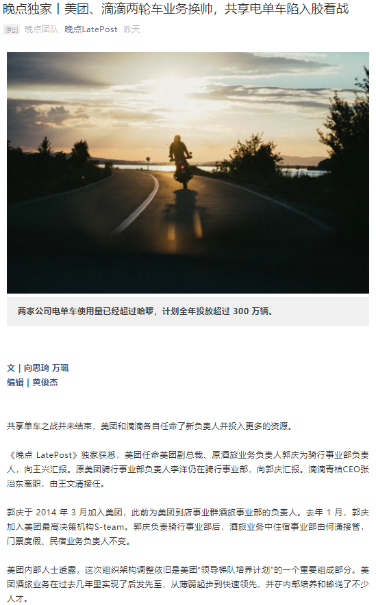 美團和滴滴各自任命了共享單車新負責人。美團任命美團副總裁、原酒旅業務負責人郭慶為騎行事業部負責人。滴滴青桔CEO張治東離職,由王文清接任。今年滴滴對電單車的投放計劃是200萬輛,美團超100萬輛。這幾乎和去年一年持平。不過這些計劃仍有變數,實際投放量還取決於業務發展情況。