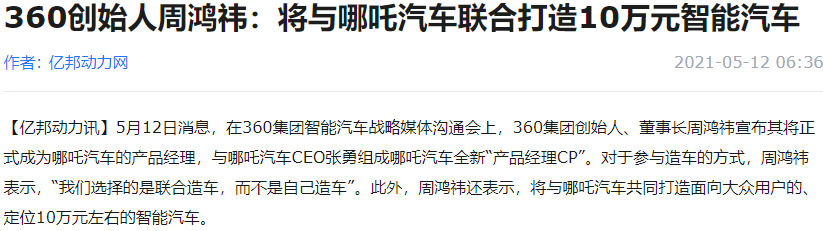 360集團創始人、董事長周鴻禕宣佈將正式成為哪吒汽車的產品經理。對於參與造車的方式,周鴻禕表示,“我們選擇的是聯合造車,而不是自己造車”。此外,周鴻禕還表示,將與哪吒汽車共同打造面向大眾用户的、定位10萬元左右的智能汽車。