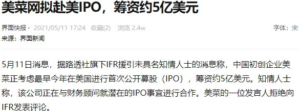 中國初創企業美菜正考慮最早今年在美國進行首次公開募股(IPO),籌資約5億美元。