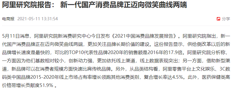阿里研究院新消費研究中心發佈《2021中國消費品牌發展報告》,指出新一代國產消費品牌正在邁向微笑曲線兩端,更加關注品牌長期價值的建設。