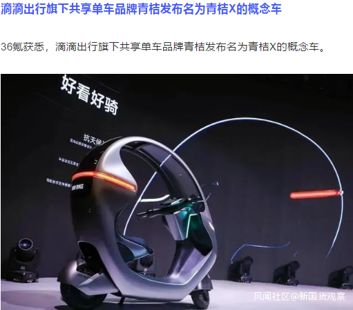 滴滴出行旗下共享單車品牌青桔發佈名為青桔X的概念車。