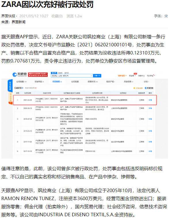 近日,ZARA關聯公司颯拉商業(上海)有限公司新增一條行政處罰信息,處罰事由為生產、銷售以不合格產品冒充合格產品。值得注意的是,此前,該公司曾多次被行政處罰,處罰事由包括違反明碼標價規定、不以自己的真實名稱和標記銷售商品、在產品中摻雜、摻假等。