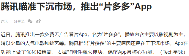 近日,騰訊推出一款免費無廣告看片App,名為“片多多”。騰訊推出“片多多”的主要原因還是在於下沉市場。