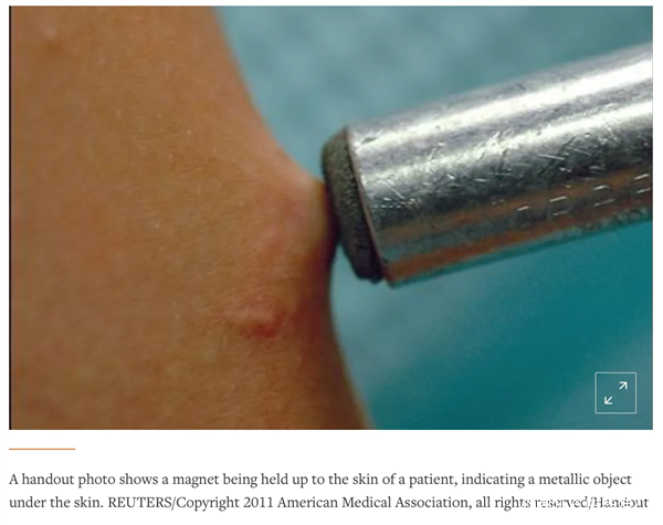 該網站還找出了一張真實的金屬物質在人體皮膚內被磁鐵吸着的照片,從照片中可以看出,人體的皮膚被磁鐵牢牢吸住,甚至皮膚出現了凸起。但社交媒體上分享的照片卻都無法顯示該角度。