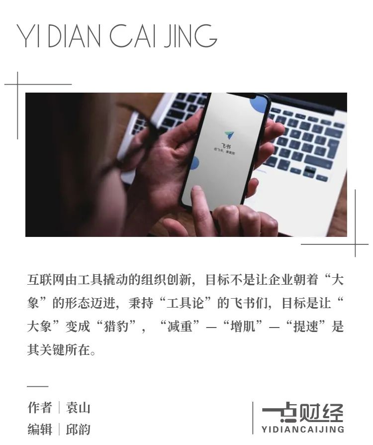 但互聯網由工具撬動的組織創新,目標不是讓企業朝着“大象”的形態邁進——雖然能帶來體量的日益龐大,卻很容易形成效率低下、成本激增、少數人決策帶來的盲進——秉持“工具論”的飛書們,目標是讓“大象”變成“獵豹”,“減重”—“增肌”—“提速”是其關鍵所在。