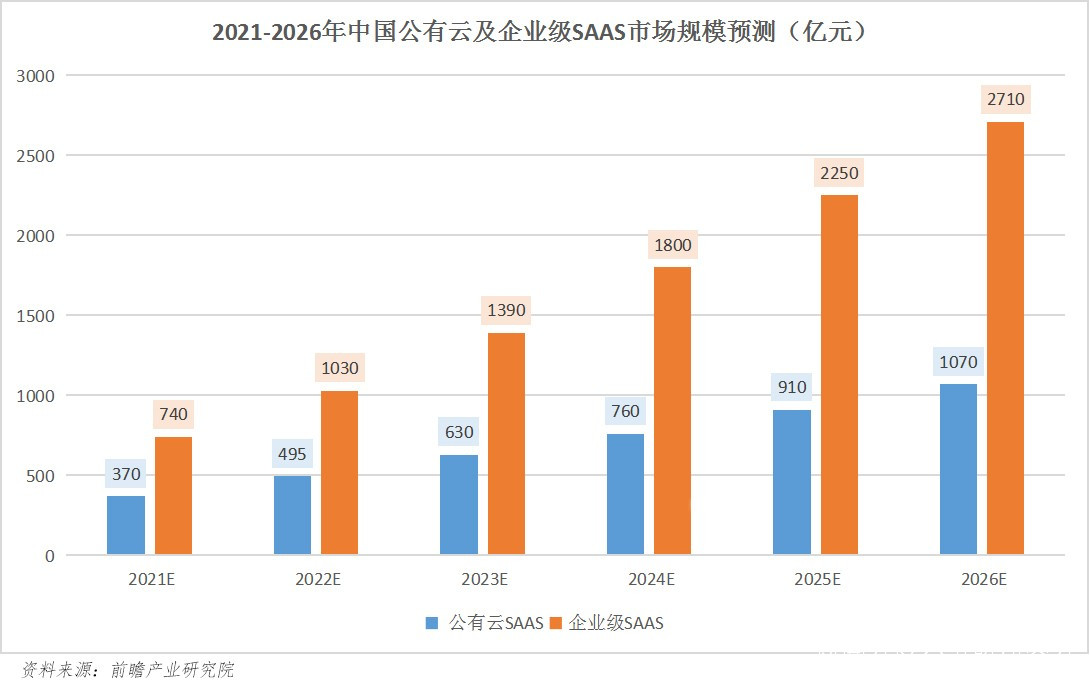 前瞻預測,2021年我國公有云SAAS市場規模將達到370億元,企業級SAAS市場規模達740億元,預計到2026年我國公有云SAAS市場規模將突破1000億元,企業級SAAS市場規模將突破2700億元。