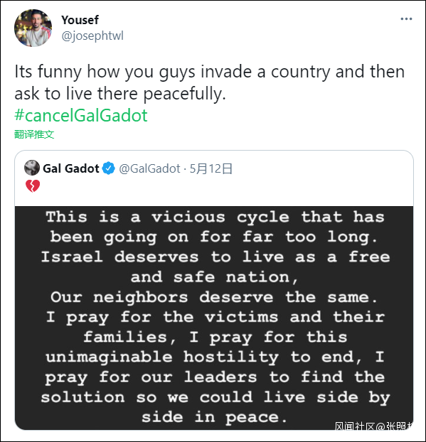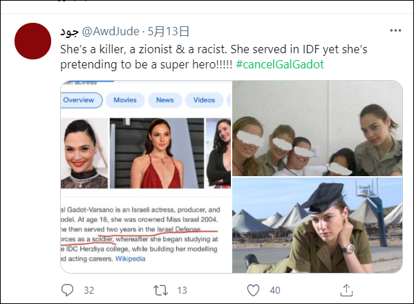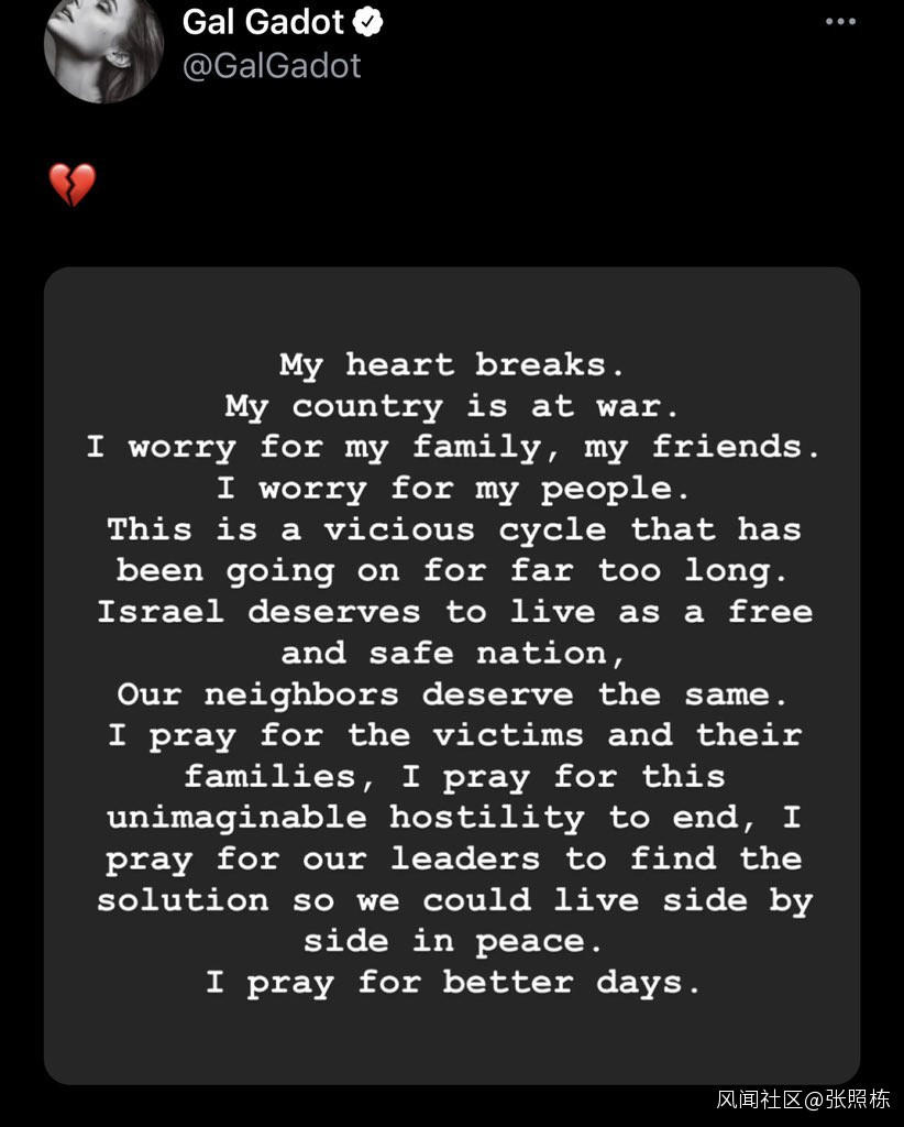 5月12日,出身以色列的“神奇女俠”蓋爾·加朵在推特發文,為自己的家人同胞祈禱,呼籲兩國迴歸和平。