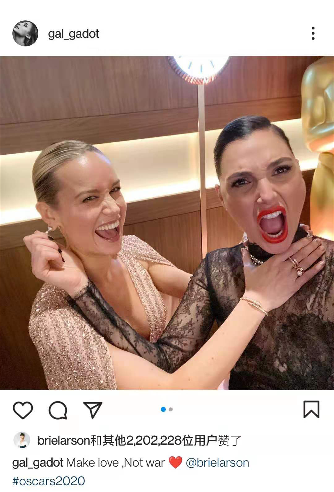 在2020年的奧斯卡頒獎典禮上,“神奇女俠”蓋爾·加朵和“驚奇隊長”布麗·拉爾森二人親密合影,引發熱議。二人還在社交媒體上喊出了美國越戰時期著名的反戰口號“要愛,不要戰爭”,呼籲雙方粉絲停止仇恨,和平相處。