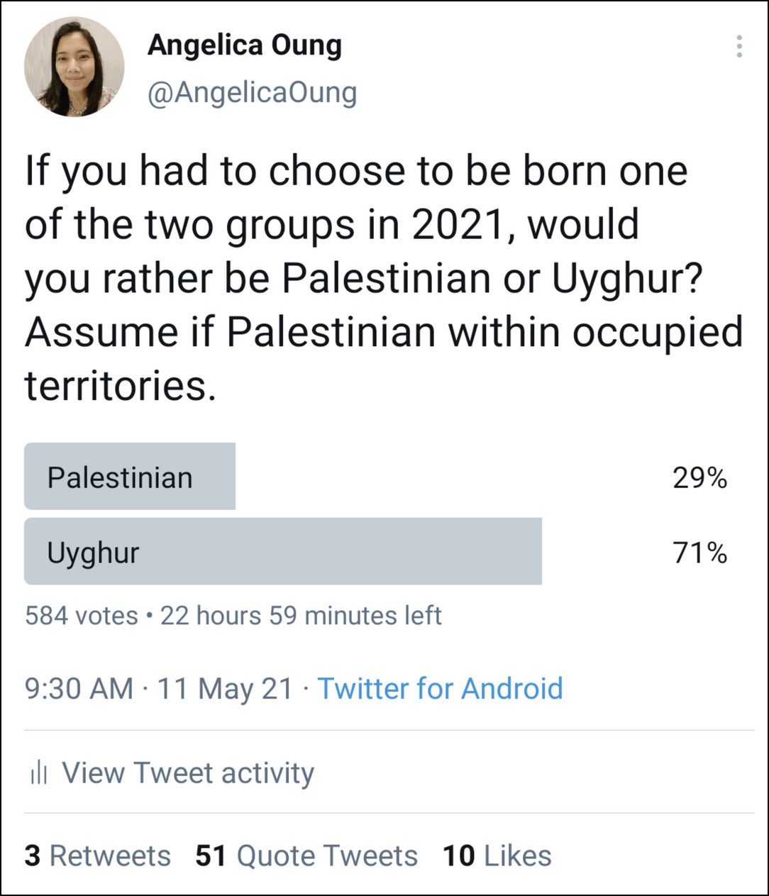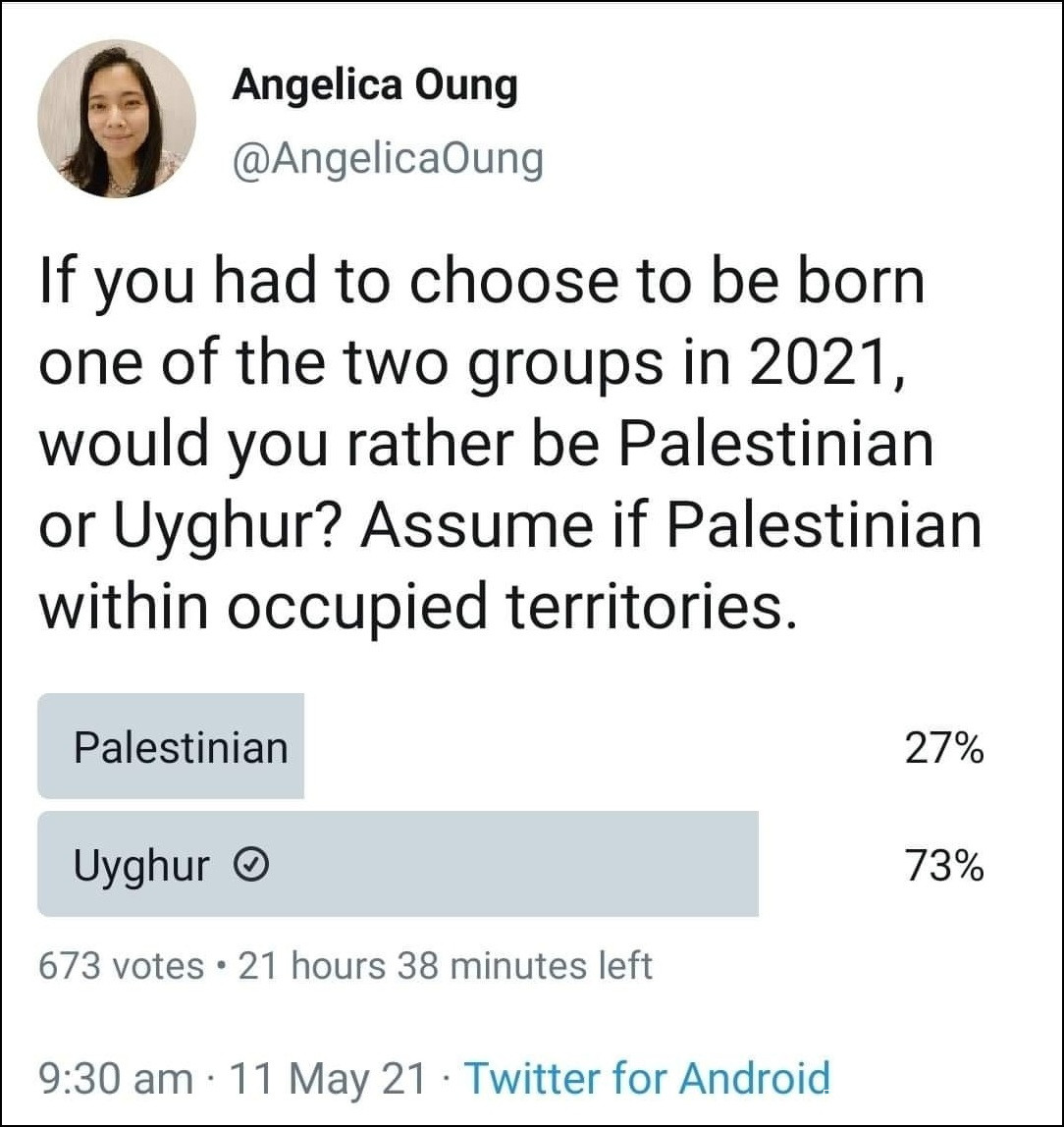 5月11日上午,Angelica Oung發推做了一個很是耐人尋味的調查:詢問網友在今天是更願意成為巴勒斯坦人還是維吾爾族人。她特別強調,這裏的巴勒斯坦人生活在“被佔領地區”,即以色列實際控制區域內。