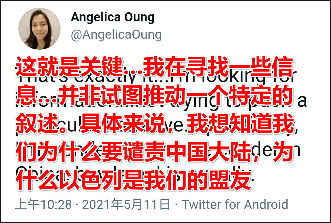 顯而易見,Angelica Oung也是不認可楊安澤的表態的;但是內心的想法又極為混亂,以致於她錯誤地將新疆問題同巴以衝突做比較。