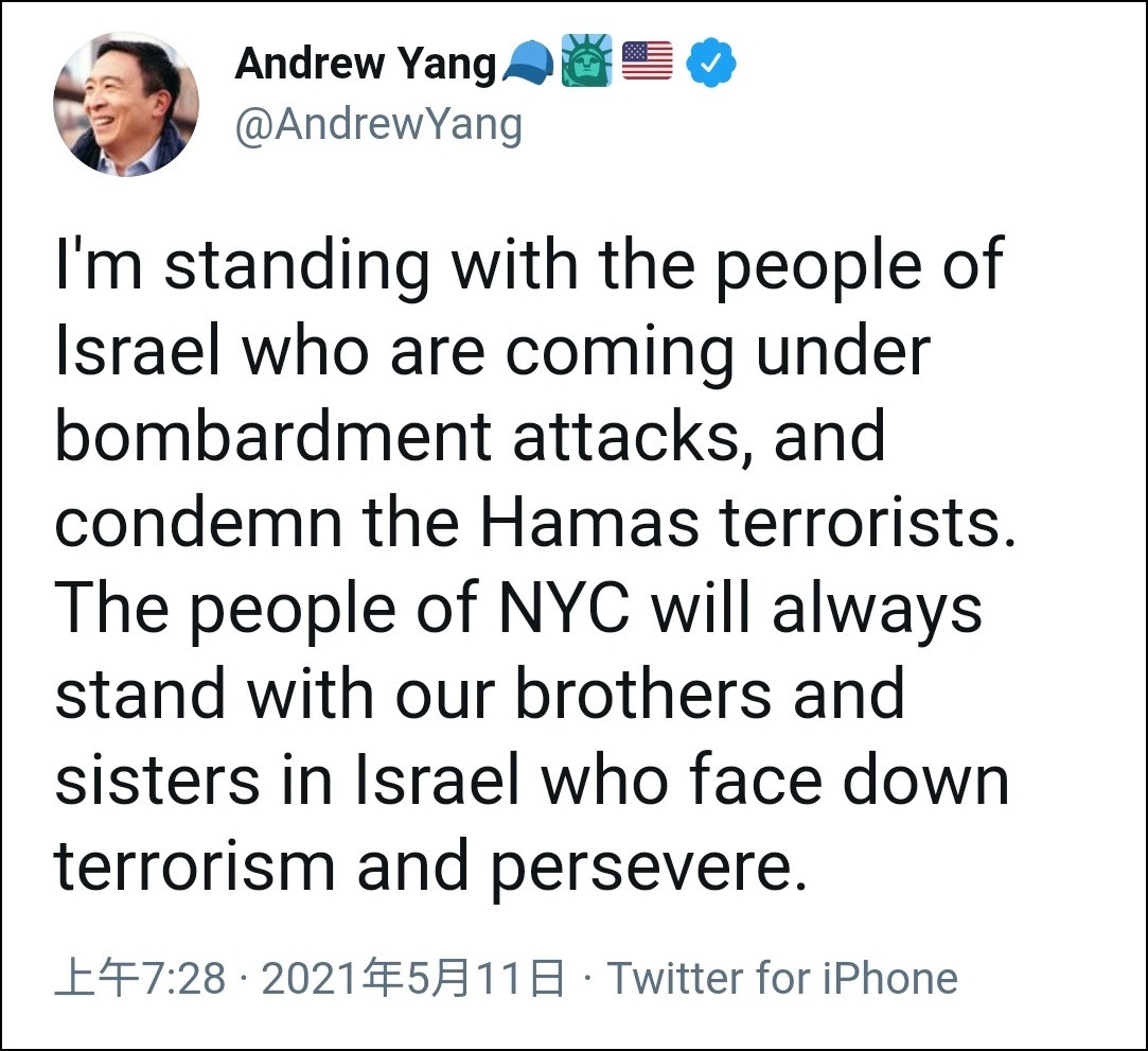 當地時間5月10日晚,也就是Angelica Oung發推進行調查前不久,楊安澤發佈推文稱,“我和遭受轟炸的以色列人民站在一起,我譴責哈馬斯恐怖分子。紐約市人民將永遠和我們的以色列兄弟姐妹站在一起,他們對抗恐怖主義,堅持不懈。”