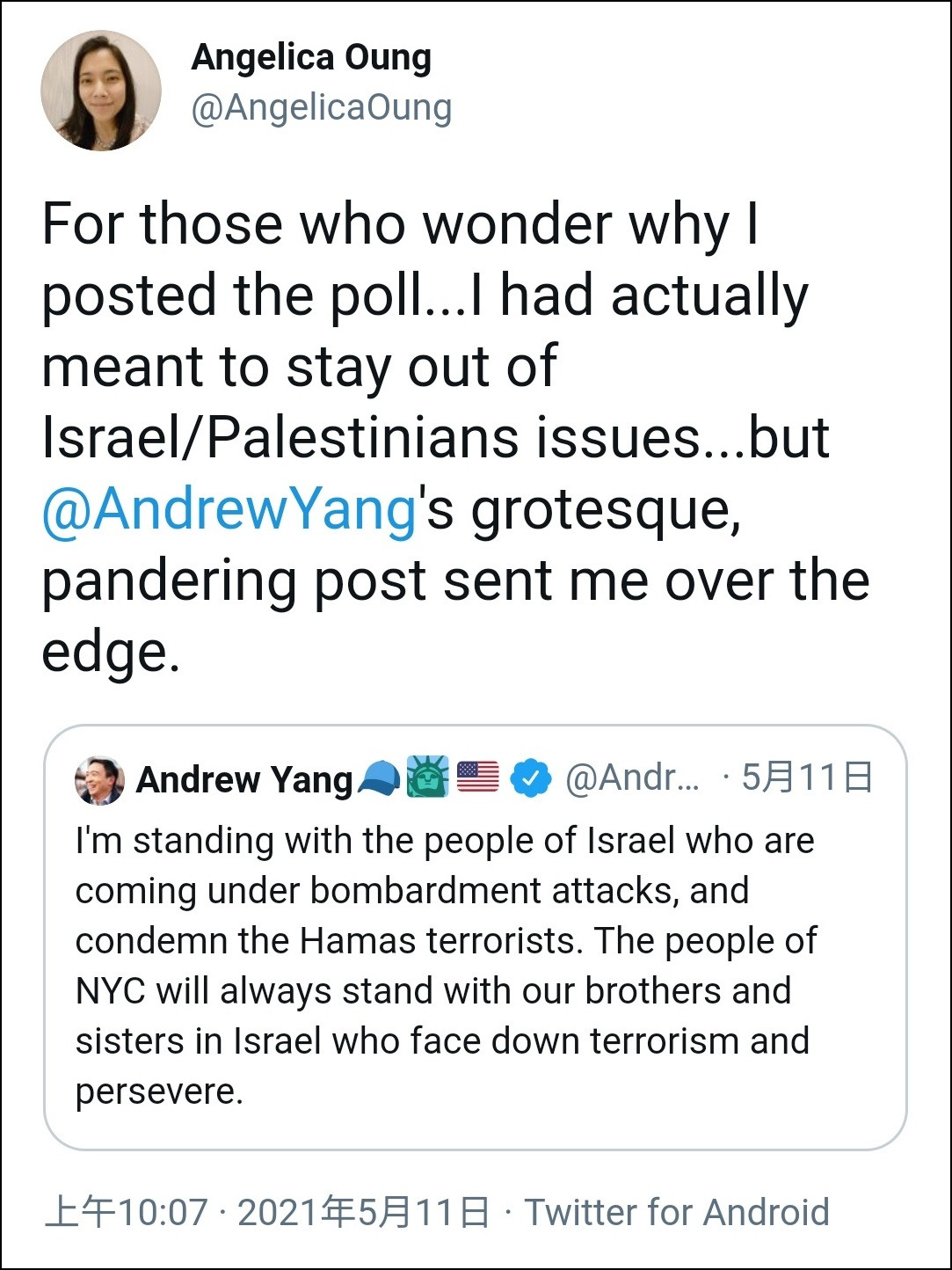 Angelica Oung還稱,自己其實是想對巴以衝突避而不談的,但美籍華裔政客楊安澤“怪誕的、迎合性的”帖子快把她給逼瘋了。