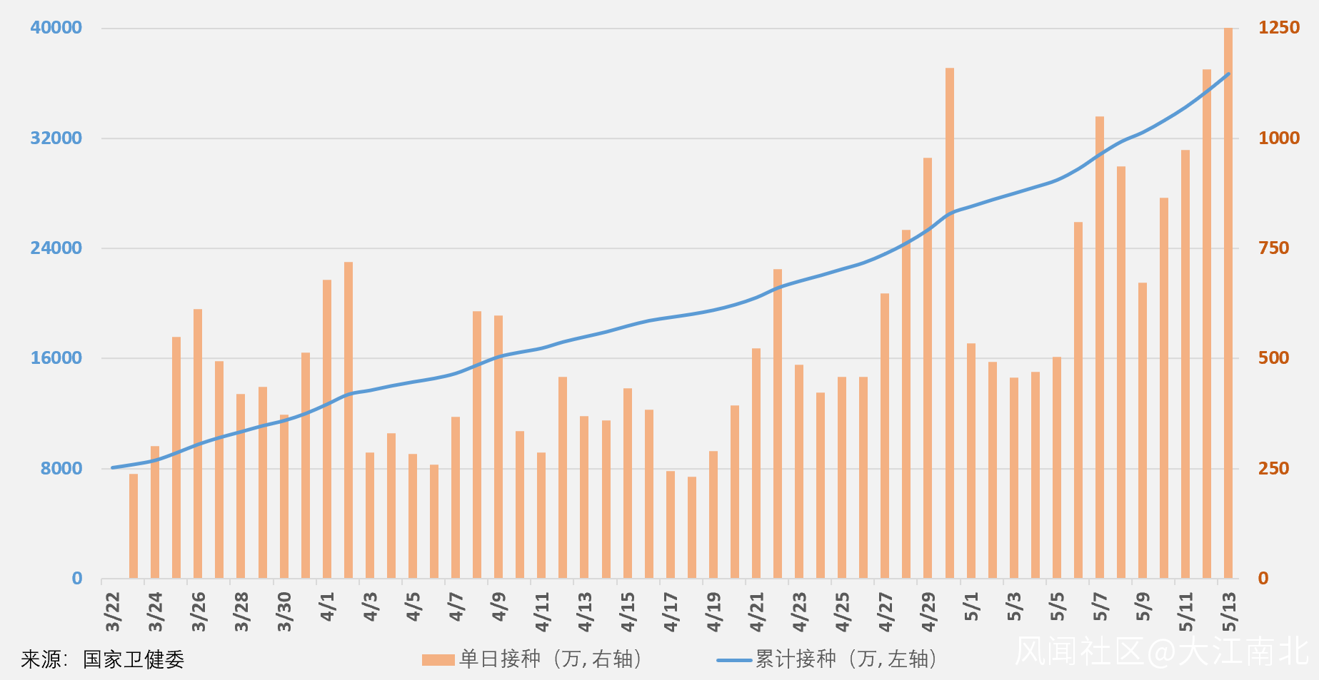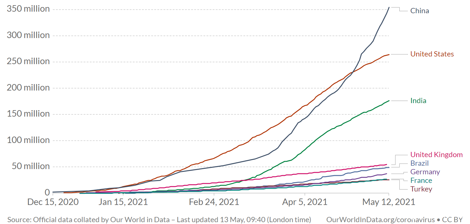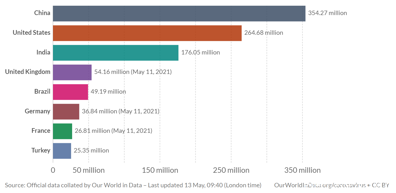 截止2021年5月13日,中國大陸累計接種新冠疫苗3.67億劑,繼續位居全球第一位,其中單日新增接種1264萬劑,環比增加106萬例,連續第二次突破1000萬例,並再創紀錄。我國自3月23日以來,日均接種562萬劑。中國每百人累計接種25.49劑,環比增加0.88劑。