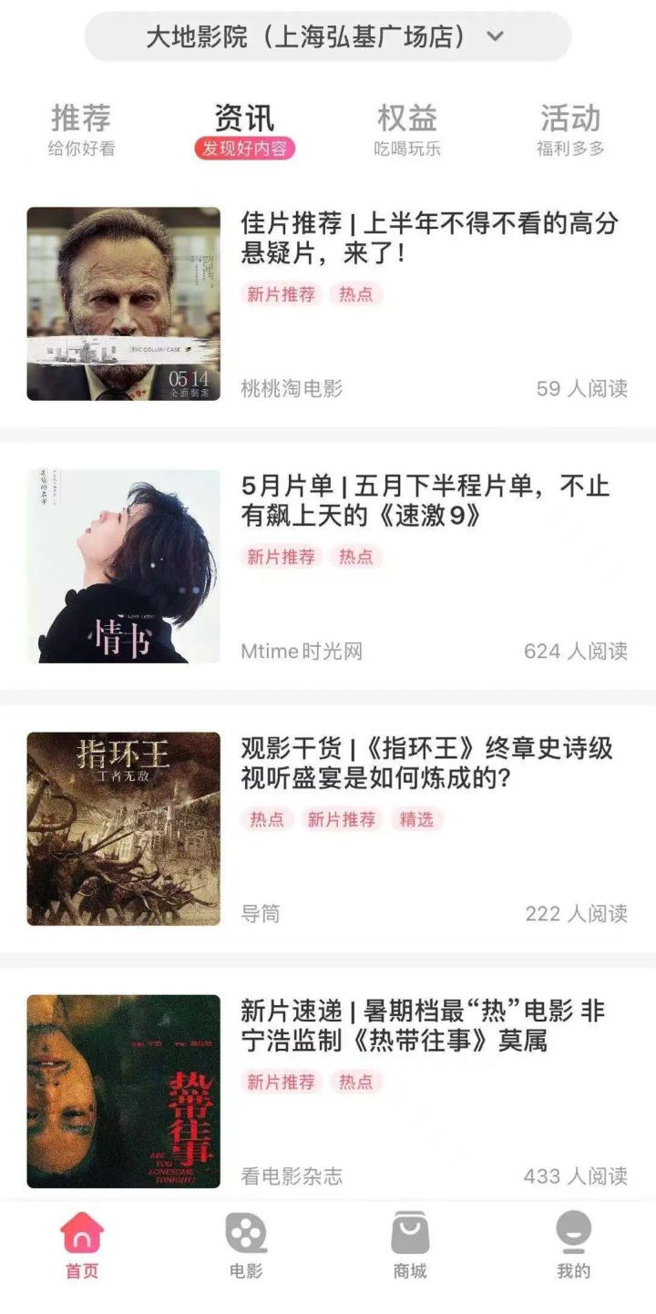 為了提高用户的使用頻次,影城自營APP也在增加產品的內容屬性。大地影院APP的“資訊”一欄,用户可以看到不同媒體平台發佈的電影文章,並撰寫評論、參與討論,通過這樣的方式提供信息和社交功能,提高用户對APP的黏性。大地影院的APP還以feed流的形態,將每一條數據、信息根據不同的用户屬性調節優先次序。不同的會員因為瀏覽習慣、購票行為的不同,接受到不同的推送信息,為了最大化地瞭解和匹配用户的喜好,從而提升會員的穩定性。“我們不會像傳統的消費或者零售型企業,把會員作為經營中的一個模塊去存在,而是把會員的思維滲透到自己經營的方方面面,包括線上、線下、資源的組織到用户的服務,我們都是以會員為中心的。”大地影院集團COO郝傑對毒眸表示:以會員為中心,是大地影院集團線上線下融合的經營體系搭建的關鍵詞和一切邏輯的落腳點。