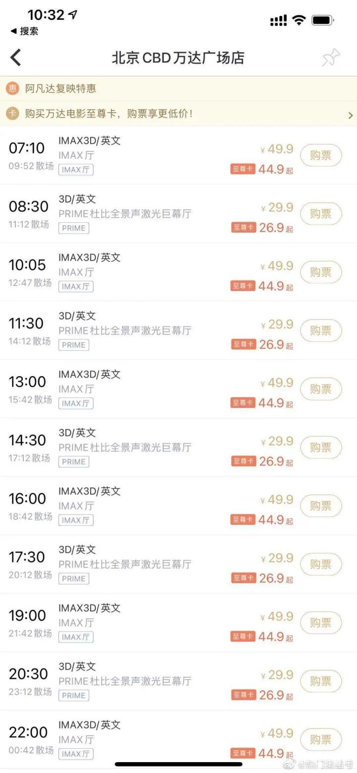兩個月前《阿凡達》重映時,打開萬達電影APP,購買一張3D 版本的電影票只需要29.9元、IMAX也只要49.9元。相比其他影城和購票渠道動輒大幾十、上百的票價,萬達的價格優勢在當時引發了不少影迷的討論。