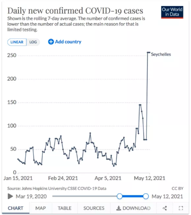 但是,悲催的事情發生了:在開放了一個月之後,塞舌爾的新冠感染數已經激增,在4月底之前,“7日平均確診感染數”不超過100人,但是到了5月10日,卻超過了250例。